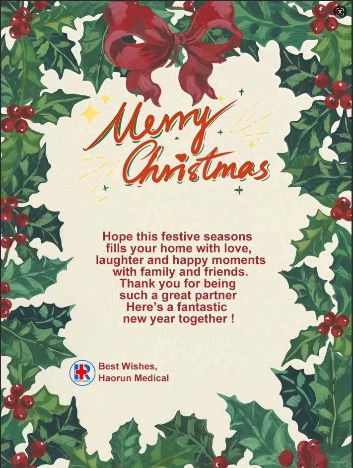 W miarę zbliżania się Świąt Bożego Narodzenia i Nowego Roku firma Haorun Medical, kluczowy gracz w światowym sektorze handlu medycznego, składa serdeczne życzenia świąteczne wszystkim pracownikom, partnerom, klientom i sympatykom. Ten okres świąteczny to czas wdzięczności i świętowania, a także nowy punkt wyjścia dla firmy do kontynuowania swojej misji polegającej na ułatwianiu przepływu wysokiej jakości zasobów medycznych i wspieraniu rozwoju globalnej opieki zdrowotnej.